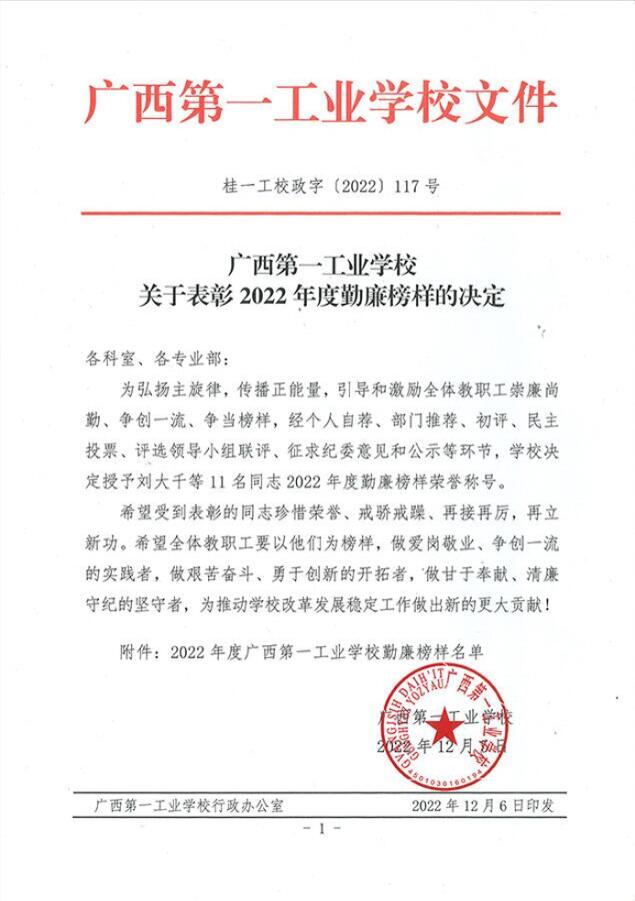 关于表彰2022年度勤廉榜样的决定