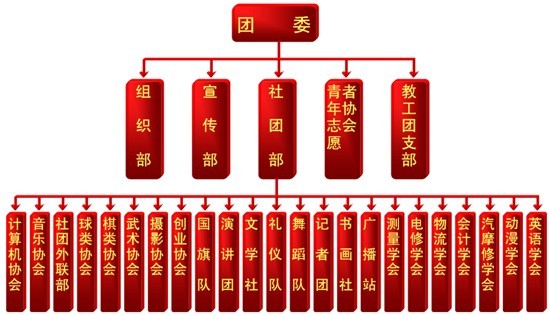 校团委设立组织部、宣传部、社团部、教工团支部、青年志愿者协会5个部门,并对23个学生社团进行直接管理。