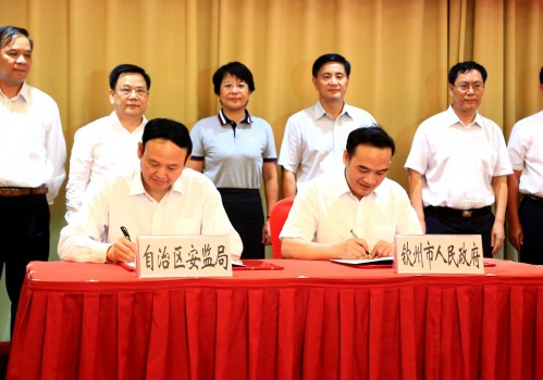 自治区安监局副局长陈家良与钦州市副市长何有成作为双方代表签订协议。