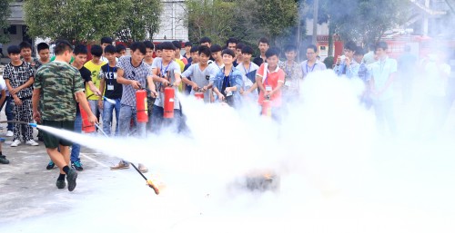 李运队长首先展示了近年来世界各国特大火灾事故及南宁市近十年来火灾事故的现场图片,惨烈的图片震撼了全场的同学。他结合图片,生动而详细地讲解了火灾的危害性和种类、如何报警、校园火灾的类型及学校采取的措施,并着重讲解遇到火灾如何自救及自救时常见的错误。同学们听得很认真,随着讲解不时发出惊叹声。培训结束后,同学们一同来到球场参加消防演习。当油桶燃起熊熊烈火,看着令人生畏。同学们在李运队长的指导下,逐个拿起灭火器进行灭火演习。