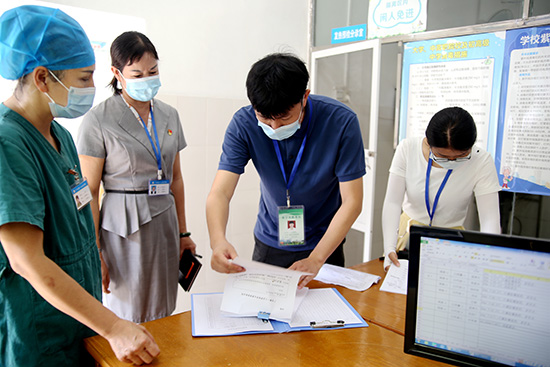 督查组一行听取学校疫情防控工作汇报,实地查看校门、教室、食堂、医务所、学生公寓等场所,详细了解学校门岗管控、校园环境消杀、核酸检测、师生健康监测等情况。
